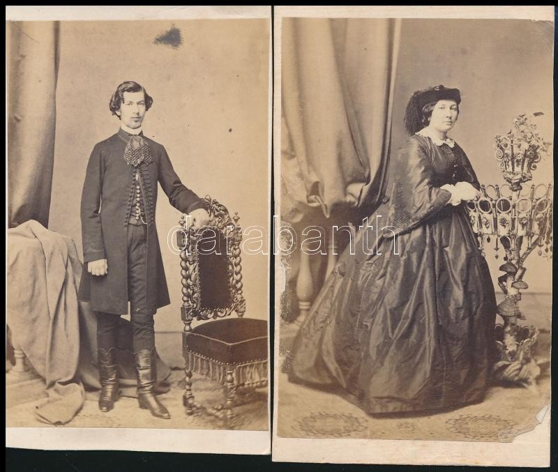 Beschreibung: cca 1859 Mayer Gy. fényképíró pesti műtermében készült, 2 db vizitkártya méretű fénykép, 10,5x6 cm