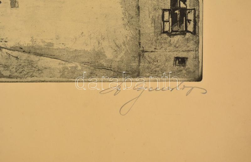 Beschreibung: Sz. Gyenes Lajos (1890-1971): Tabáni panoráma, rézkarc, papír, jelzett, 21,5×33 cm