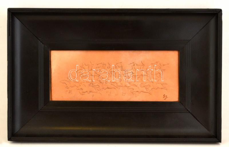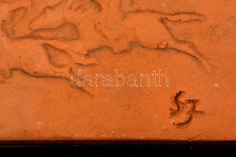 Beschreibung: Somogyi József (1916-1993): Nyilazó magyarok. Kerámia, jelzett, keretben, 13×33 cm