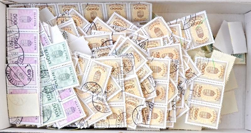 Beschreibung: Modern illetékbélyegek ömlesztve dobozban, közte magas címletek is (papírváltozatok kutatáshoz)