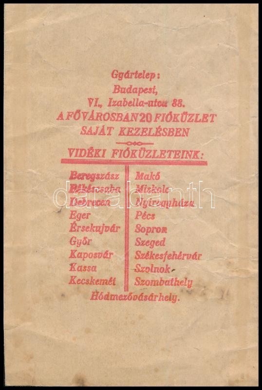 Cadeau csokoládégyár Rt. Budapest papírtasak, hátoldalon a fióküzletek... https://www.darabanth.com/de/327-Fernauktion/327.0/Andere-Sammelgebiete/Werbungen~1500021/Cadeau-csokoladegyar-Rt-Budapest-papirtasak-hatoldalon-a-fiokuzletek-listajaval~II1824220