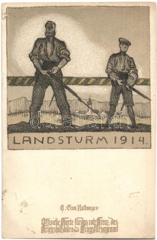 1914 Landsturm. Offizielle Karte für das Rote Kreuz, das Kriegshilfsbüro und Kriegsfürsorgeamt / WWI Austro-Hungarian K.u.K. military art postcard. s: H. Grom Rottmayer (kis szakadás / small tear)