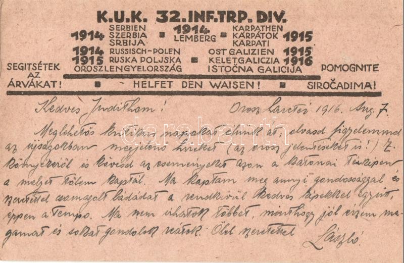 1916 K.u.K. 32. Inf. Trp. Div. Feldpostkarte / A 32. gyaloghadosztály ... https://www.darabanth.com/de/327-Fernauktion/327.0/Ansichtskarten/Militaria~1000065/1916-KuK-32-Inf-Trp-Div-Feldpostkarte-A-32-gyaloghadosztaly-tortenete-Osztrak-magyar-~II1819449