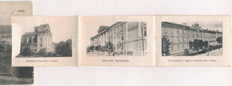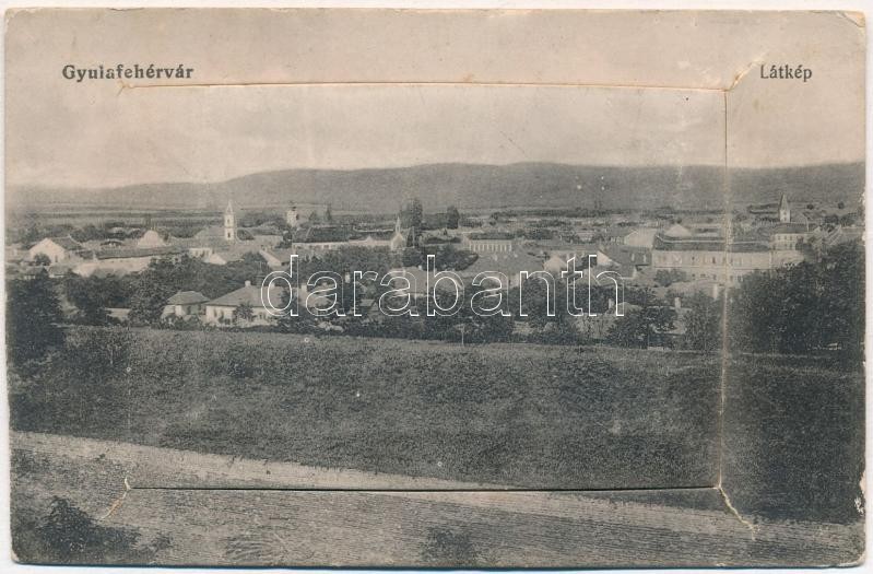 Gyulafehérvár, Alba Iulia; leporellolap 10 képpel, benne: Batthyány könyvtár a várban, Tiszti pavilon, Ferenc József utász laktanya, Alsó várkapu, Custozai ütközet emlékoszlopa, Hungária szálloda, Európa szálloda, stb. Weisz Bernát kiadása / leporellocard, inside: library in the castle, K.u.K. military sappers barracks, castle gate, hotels, monument (EK)