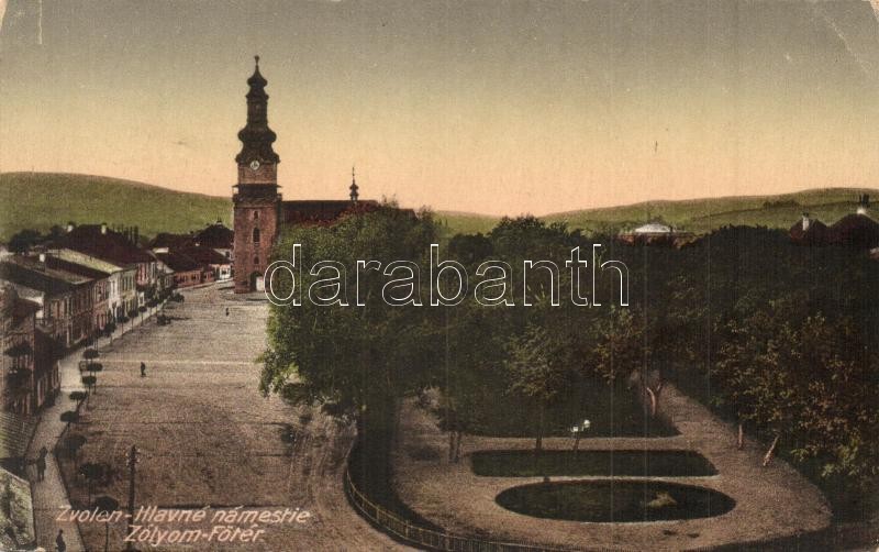 Beschreibung: Zólyom, Zvolen; Hlavné námestie / Fő tér, Római katolikus templom, üzletek / main square, Catholic church, shops (EK)