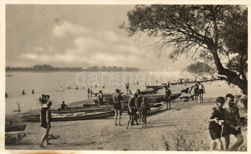 Beschreibung: Alsógöd (Göd), Strand, fürdőzők, evezős csónakok (EB)