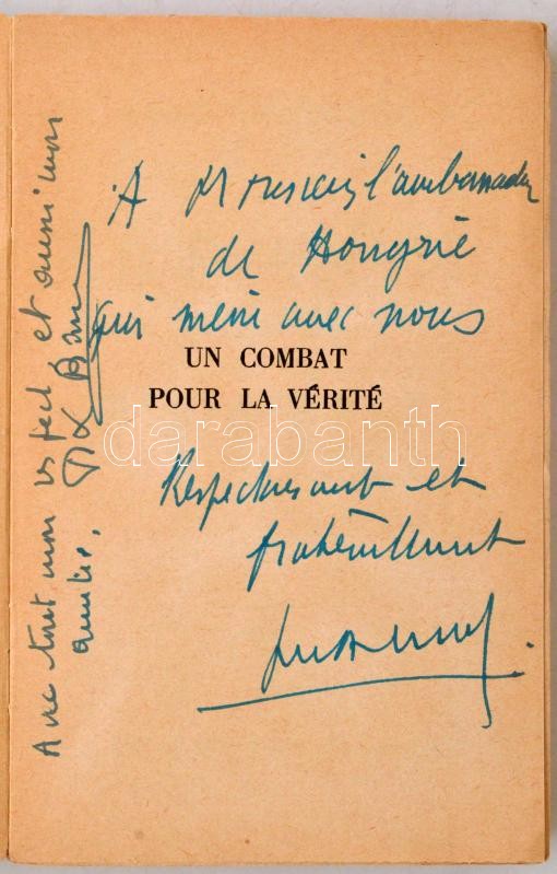Jean Marcenac: Un combat pour la vérité. Paris,1949, La Bibliothéque Francaise, 326 p. Kiadói papírkötés. Francia nyelven. A szerző dedikációjával. A borítója némileg sérült. /
