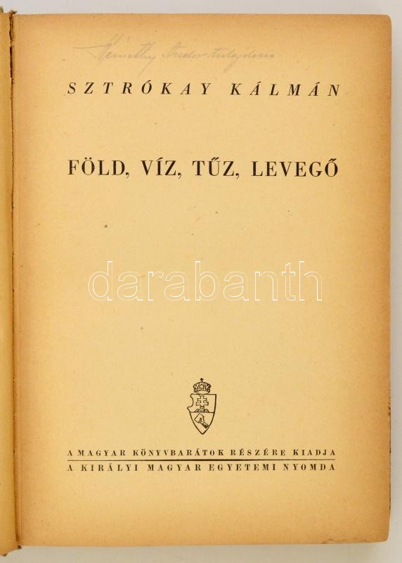 Sztrókay Kálmány: Föld, víz, tűz, levegő. Bp., 1944, Kir. Magyar Egyet... https://www.darabanth.com/de/327-Fernauktion/327.0/Bucher/Bucher-Andere-kuriositaten~2500019/Sztrokay-Kalmany-Fold-viz-tuz-levego-Bp-1944-Kir-Magyar-Egyetemi-Nyomda-Kiadoi-fe~II1788072