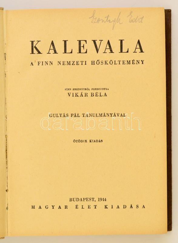 Kalevala. A finn nemzeti hősköltemény. Fordította Vikár Béla. Bp., 194... https://www.darabanth.com/de/327-Fernauktion/327.0/Bucher/Bucher-Geschichte~2500004/Kalevala-A-finn-nemzeti-hoskoltemeny-Forditotta-Vikar-Bela-Bp-1944-Magyar-Elet-Otodi~II1796240