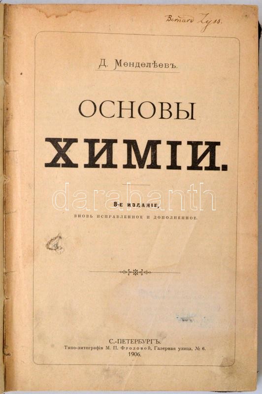 Mengyelejev, D[mitrij]: Osznovi himii [A kémia alapjai]. Szentpétervár, 1906, M. P. Frolovoj. Sérült gerincű vászonkötésben, egyébként jó állapotban. / Mendeleev, D[mitriy]: Osnovy khimii [The Foundations of Chemistry]. Saint Petersburg, 1906, M. P. Frolovoy. Cloth binding with damaged spine, otherwise in good condition.