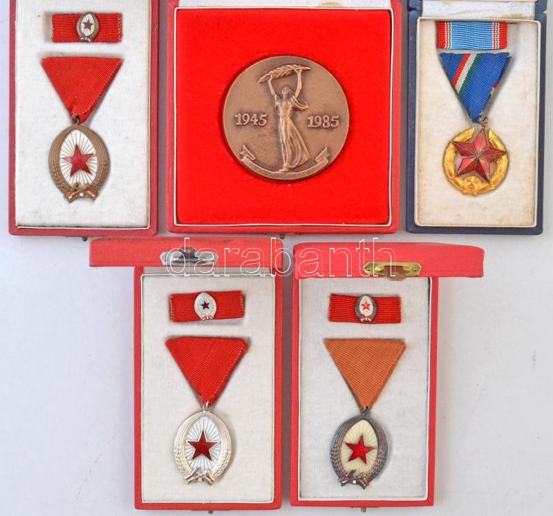 Vegyes: 5db-os szocialista kitüntetés és plakett tétel, bennek Közbiztonsági érem arany fokozata, Munka Érdemrend ezüst fokozata (2x), Munka Érdemrend bronz fokozata T:2,2-