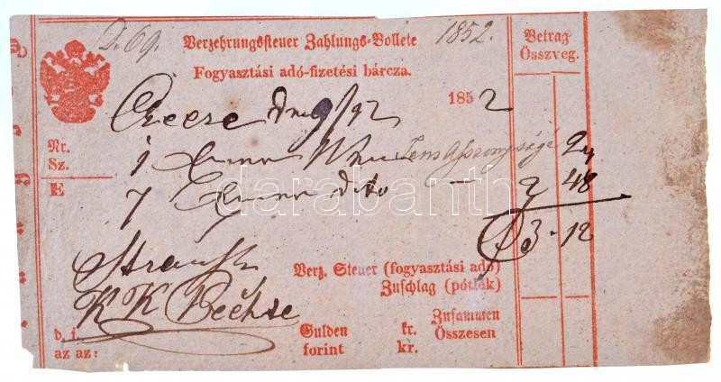 1852. "Fogyasztási adó-fizetési bárca" német nyelvű, kézírással kitöltve T:II / Hungary 1852. "Consumption tax label" German language, the form filled with handwriting C:XF
