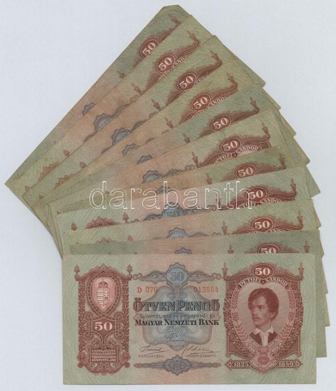 1932. 50P (15x) T:III,III- https://www.darabanth.com/de/327-Fernauktion/327.0/Numismatik/Ungarische-Banknoten~2000007/1932-50P-15x-TIII-III-~II1821150