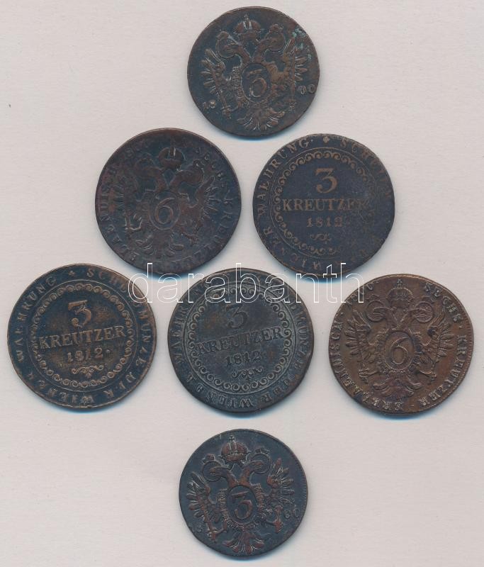 Beschreibung: 1800. 3kr Cu (2xklf) "G" és "S" verdejelek + 1800. 6kr Cu (2xklf) "B" és "S" verdejelek + 1812. 3kr (3x) "B" és "S" verdejelek T:2-3