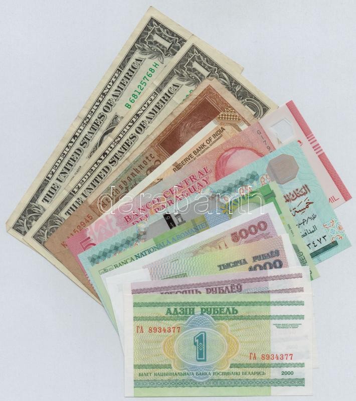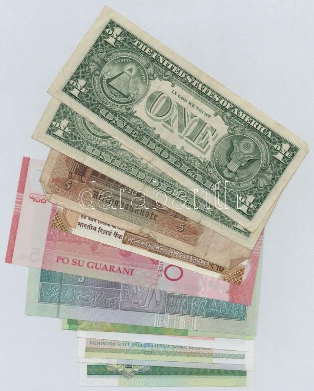11db-os vegyes külföldi bankjegy tétel, közte Amerikai Egyesült Államok, Egyiptom, India, Paraguay T:I,III,III-