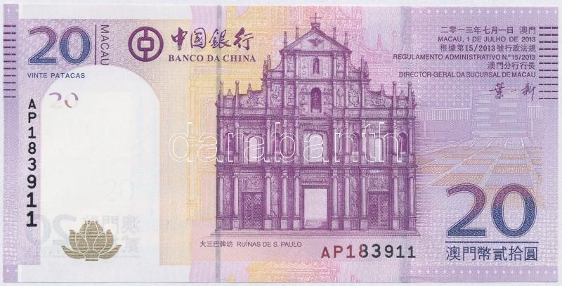 Macau 2013. 20 Patacas C:UNC https://www.darabanth.com/de/327-Fernauktion/327.0/Numismatik/Weltweit-Banknoten~2000012/Makao-2013-20P-TI-Macau-2013-20-Patacas-CUNC~II1819379