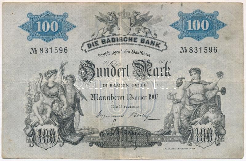 German States / Baden 1907. 10... https://www.darabanth.com/de/327-Fernauktion/327.0/Numismatik/Weltweit-Banknoten~2000012/Nemet-Allamok-Baden-1907-100M-TIII-German-States-Baden-1907-100-Mark-CF~II1818346