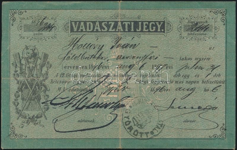 1895 Vadászati jegy. Vadászjegy / hunters licence https://www.darabanth.com/de/328-Fernauktion/328.0/Andere-Sammelgebiete/Dokument~1000017/1895-Vadaszati-jegy-Vadaszjegy-hunters-licence~II1825883