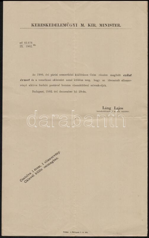 1902 Bp., Láng Lajos kereskedelemügyi miniszter által küldött levél a ... https://www.darabanth.com/de/328-Fernauktion/328.0/Andere-Sammelgebiete/Dokument~1000017/1902-Bp-Lang-Lajos-kereskedelemugyi-miniszter-altal-kuldott-level-a-parizsi-nemzetkozi-kiC3~II1828666