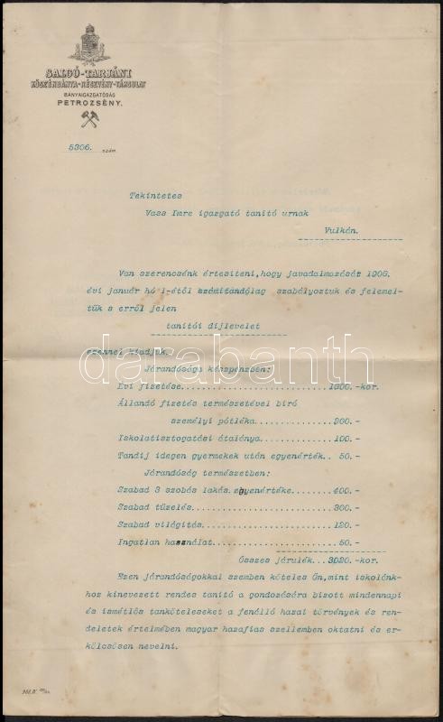 Beschreibung: 1908 Petrozsény, Salgó-Tarjáni Kőszénbánya-Részvény-Társulat Bányaigazgatósága által iskolaigazgatónak küldött számadás