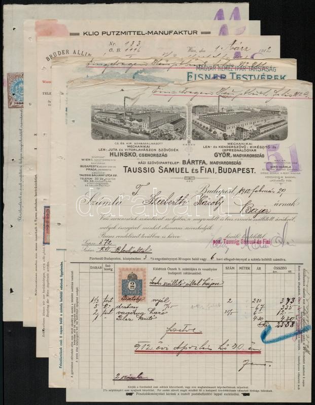 Beschreibung: 1912-1917 5 db különböző gyár díszes fejléces számlája, okmánybélyegekkel