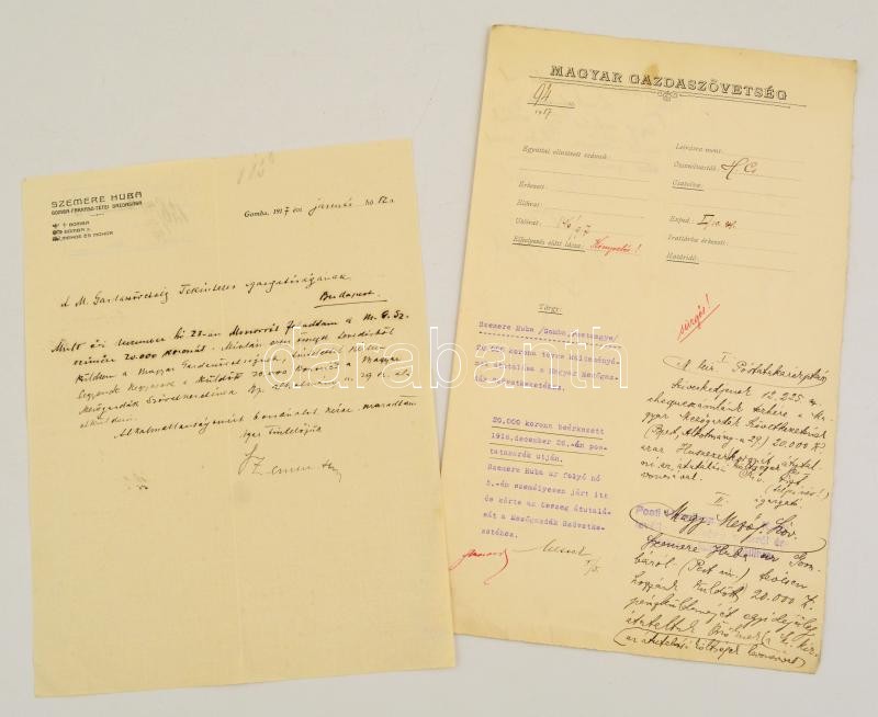 1917 a Magyar Gazdaszövetség két irata Szemere Huba által utalt pénzös... https://www.darabanth.com/de/328-Fernauktion/328.0/Andere-Sammelgebiete/Dokument~1000017/1917-a-Magyar-Gazdaszovetseg-ket-irata-Szemere-Huba-altal-utalt-penzosszeg-targyaban~II1831025