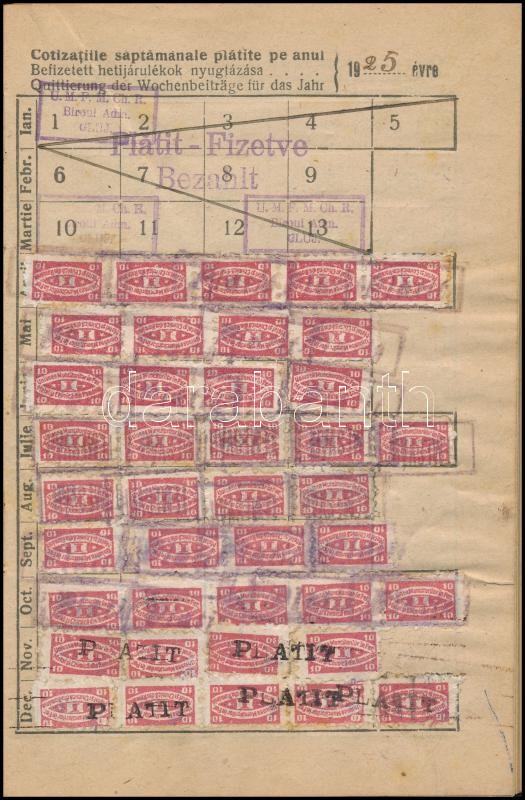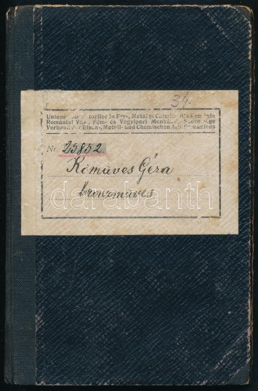 Beschreibung: 1923 A Romániai Vas-, Fém- és Vegyipari Munkások szövetsége által bronzműves számára kiállított tagsági könyv, sok tagdíjbélyeggel