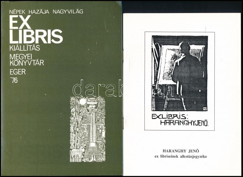Vegyes ex libris szakirodalom tétel, 6 db.: 1964 Magyar írók, művészek és tudósok ex librisei. Kiállítási katalógus. Bp., OSZK-Kisgrafikai Barátok Köre. 1965 Kisgrafika bemutató. Kiállítási katalógus. Bp., Kisgrafikai Barátok Köre. Megjelent 300 példányban. 1966 Mai lengyel ex libris kiállítás. Bp.,1966, Malborki Vármúzeum-Lengyel Kúltúra-OSZK. 1976 Ex Libris kiállítás. Eger, Megyei könyvtár. 1976 1994 Haranghy Jenő ex libriseinek alkotásjegyzéke. Balatonfűzfő, Palásthy Bt. 1995 Fery Antal fametszeteinek alkotásjegyzéke IV. rész: 1987-1993. Bp., Kisgrafikai Barátok Köre.