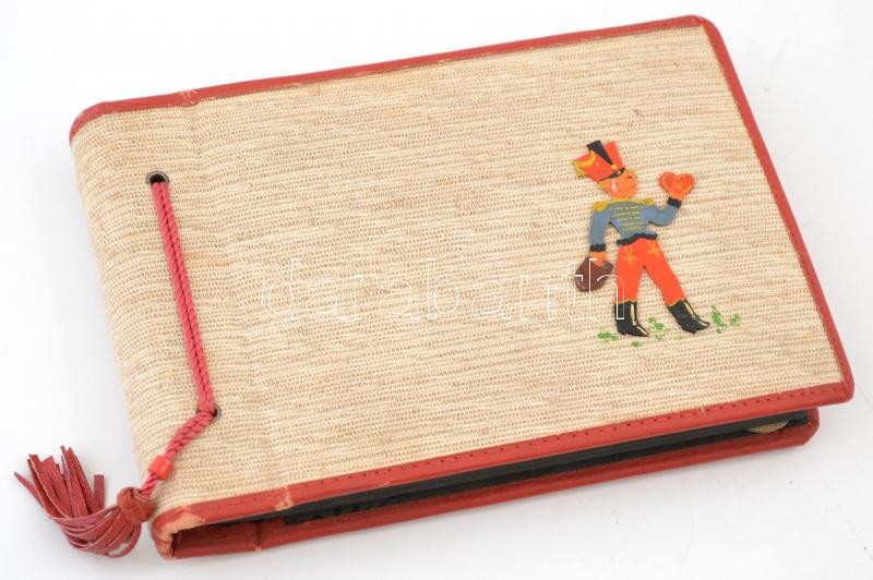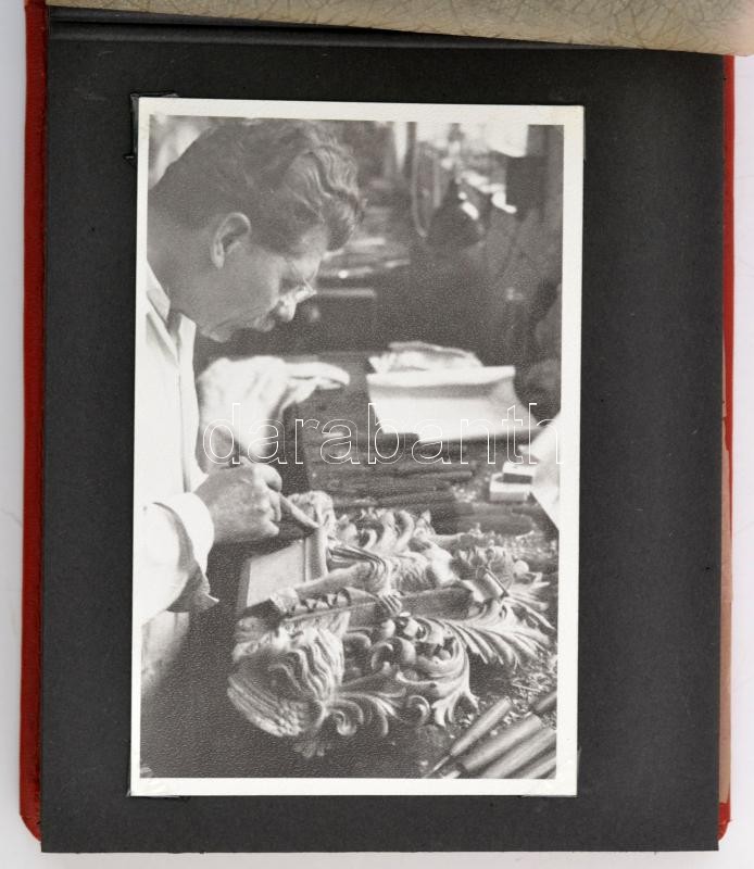 Beschreibung: 1943 Budapest, Dénes Miklós (?-?) fafaragó munkái a Műcsarnok tavaszi kiállításán, 22 db fotó, albumba rendezve + Dénes Miklós aláírása 1961-es levelezőlapon