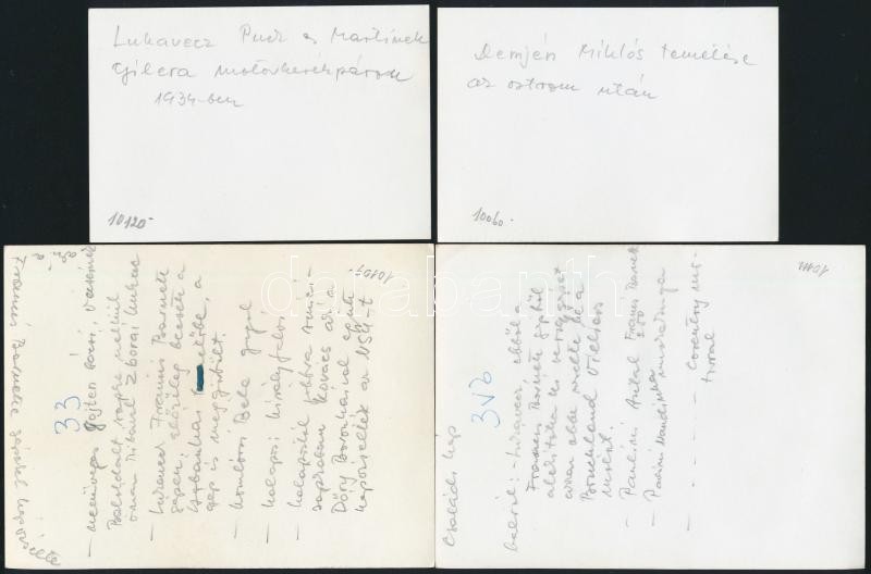 Motorversenyezők motorjaikon (Lukavecz, Paulini, stb.), valamint Dr. Demjén Miklós motoros temetése, 4 db fotó, utólagos előhívás, hátoldalon feliratozva, 6,5×9,5 és 9×12 cm