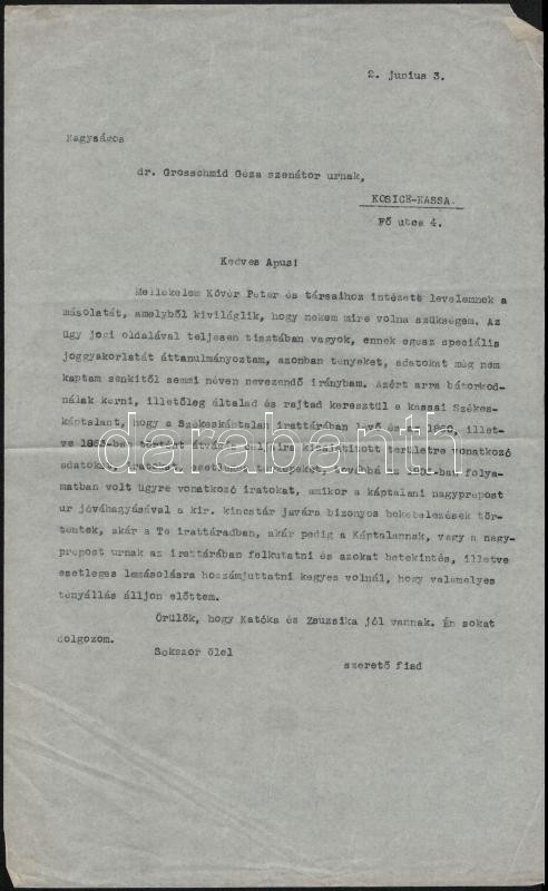 cca 1920-1932 Kassa, Dr. Grosschmid Géza (1872-1934) felvidéki kisebbségi politikus, szenátor, későbbi miskolci királyi közjegyző, Márai Sándor (1900-1989) író, Radványi Géza (1907-1986) Kossuth-díjas magyar filmrendező, forgatókönyvíró, főiskolai tanár, író, publicista, és Grosschmid Gábor, Groschmid Katalin apjának szóló gépelt levél, valamelyik fiától, aláírás nélkül.