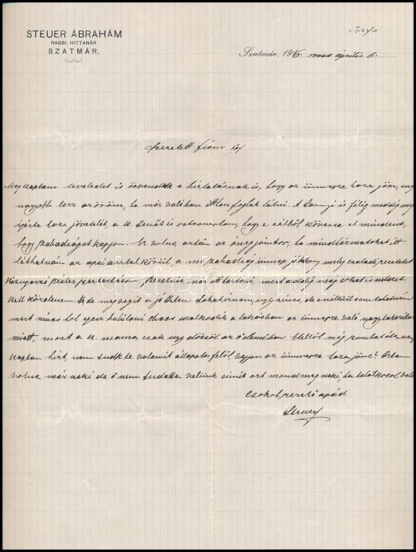 1911 Szatmár, Steuer Ábrahám rabbi, saját kezű levele / Ábrahám Steuer... https://www.darabanth.com/de/328-Fernauktion/328.0/Andere-Sammelgebiete/Judaica~1000025/1911-Szatmar-Steuer-Abraham-rabbi-sajat-kezu-levele-Abraham-Steuer-rabbis-letter~II1828916
