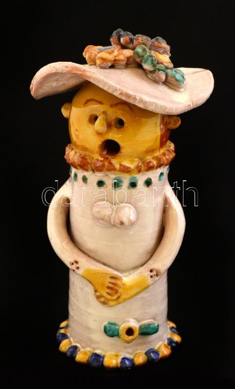 Beschreibung: Csavlek Etelka (1947-): Kalapos figura. Festett mázas kerámia, jelzett, hibátlan, m: 14 cm