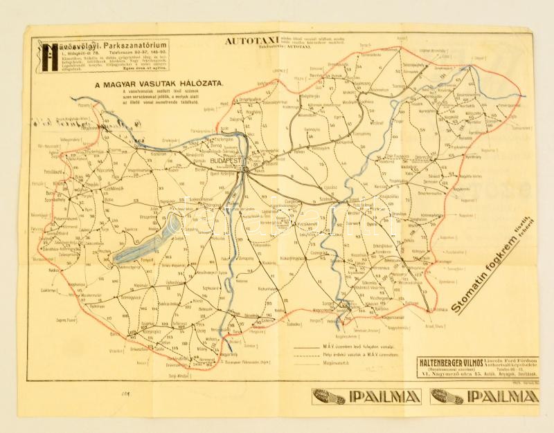 1923 A magyar vasutak hálózata, térkép reklámokkal, 29×38 cm https://www.darabanth.com/de/328-Fernauktion/328.0/Andere-Sammelgebiete/Landkarten~1000029/1923-A-magyar-vasutak-halozata-terkep-reklamokkal-29C39738-cm~II1829069