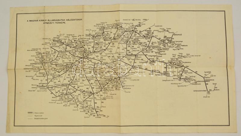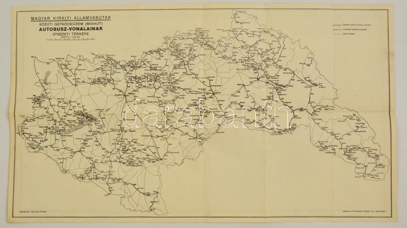 1941 A Magyar Királyi Államvasutak közúti gépkocsiüzem (MÁVAUT) autóbuszvonalainak átnézeti térképe és vasúti hálózati térképe, két oldalas térkép, Magyar Földrajzi Intézet Rt., 58x33 cm