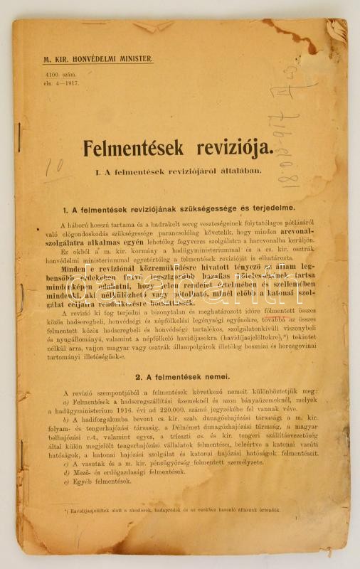 1917. A m. kir. Honvédelmi Minister rendelete: Felmentések revíziója. ... https://www.darabanth.com/de/328-Fernauktion/328.0/Andere-Sammelgebiete/Militaria~1000028/1917-A-m-kir-Honvedelmi-Minister-rendelete-Felmentesek-revizioja-63-oldalas-rendelet-a-kato~II1817640