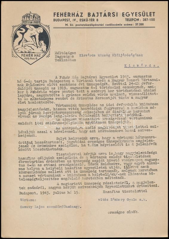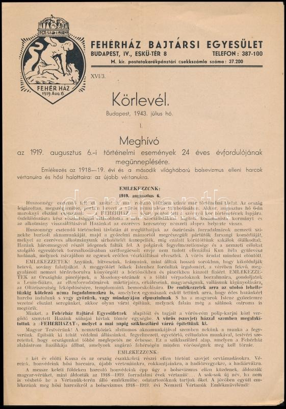 1943 Fehérház Bajtársi Egyesület körlevele + levele https://www.darabanth.com/de/328-Fernauktion/328.0/Andere-Sammelgebiete/Militaria~1000028/1943-Feherhaz-Bajtarsi-Egyesulet-korlevele-plus-levele~II1830798
