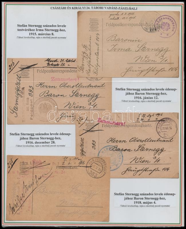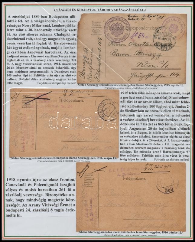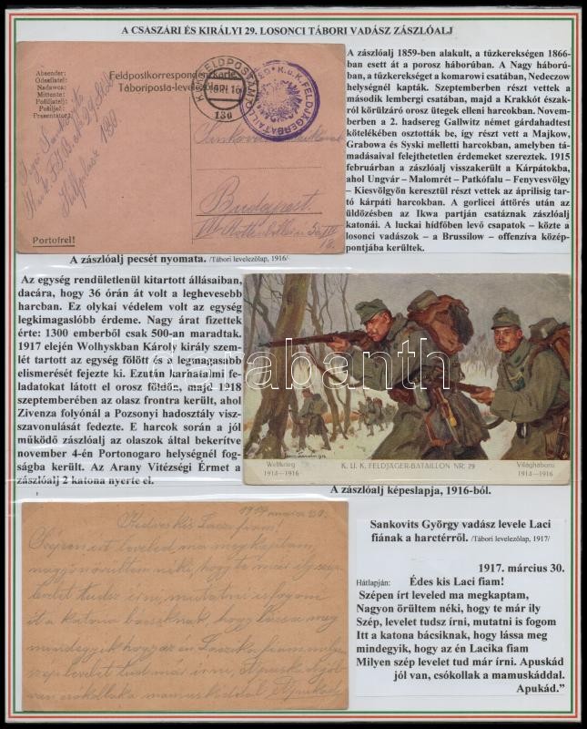 A cs. és kir. 29. losonci tábori vádászzászlóalj és a cs. és kir. 24. tábori vadászzászlóaljának története. Különleges, egyedi összeállítás az első világháborús vadászzászlóaljakról, 3 db nemzetiszín tablón részletes nyomtatott szöveggel, rajta 1 db eredeti képeslappal (1916), 9 db tábori levelezőlappal, a képeslapok, fotók nincsenek felragasztva a tablókra. / The History of 29th Austro-Hungarian Army Military Police Regiment ("k.u.k. Feldjägerbataillon") of Lučenec (Lizenz) and 29th Austro-Hungarian Army Military Police Regiment ("k.u.k. Feldjägerbataillon"), with 1 pc original postcard (1916), 9 pc. army field service postcards, on 3 pc. sheets, not glued on the paper.