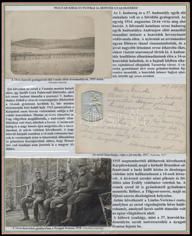 A magyar királyi 14. nyitrai honvéd gyalogezred története. Különleges, egyedi összeállítás az első világháborús gyalogezredről, 1 nemzetiszín tablón részletes nyomtatott szöveggel, 3 eredeti képeslappal (1915-1918), az egyiken a gyalogezred címerével, kettőn fotóval, a képeslapok, fotók nincsenek felragasztva a tablókra./ History of 14th Hungarian Royal Army Infantry Regiment of Nitra(Neutra), with three orginal postcard, on 1 sheet, not glued on the paper.