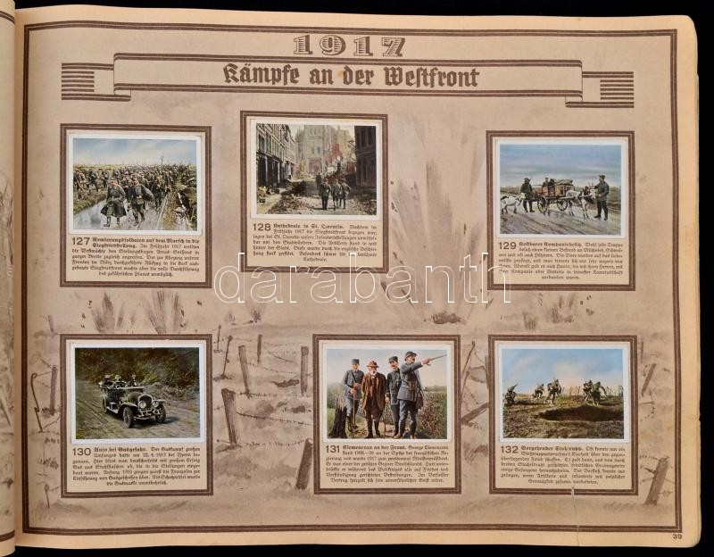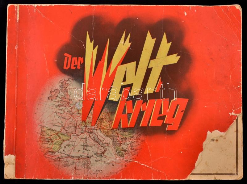 cca 1930 Der Welt Krieg. 1914-1918. 268 cigaretta kártyával. Dresden, é.n.,Cigaretten-Bilderdienst. Német nyelven. Kiadói papírkötésben, szakadozott, sérült, hiányos elülső borítóval, 2 cigaretta kártya hiányzik. /The World War 1914-1918, 268 pieces of cigaretta cards, in German language, damaged, 2 pieces of card lost.