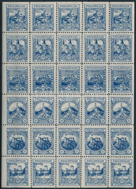 Beschreibung: Philatelia Budapest 1921 kék színű irredenta levélzáró használatlan teljes ív benne 5 x 6 különféle bélyeg az elszakadt területek várainak képével