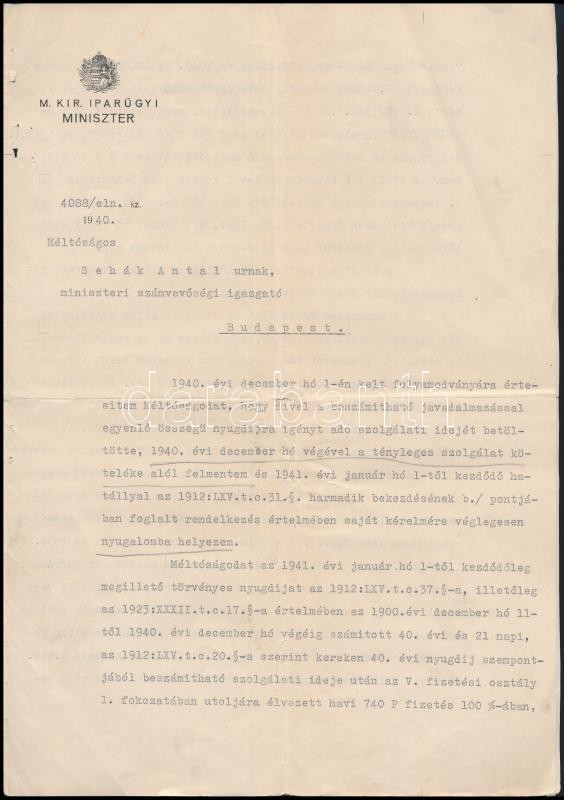 Beschreibung: 1940 Hivatalos irat Varga József iparügyi miniszter aláírásával