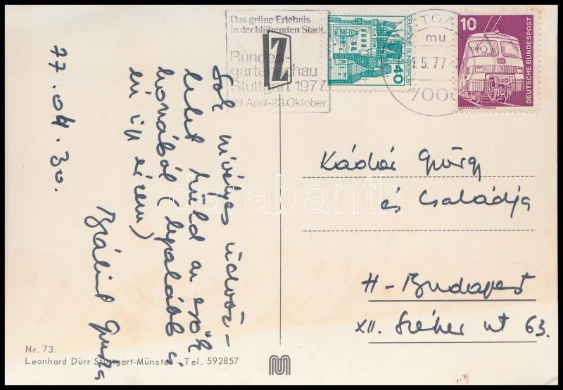 1977 Bálint György (1919-) kertészmérnök üdvözlő sorai és aláírása egy Kádár György (1912-2002) Kossuth-díjas festő, grafikus, főiskolai tanár és felesége részére küldött képeslapon.