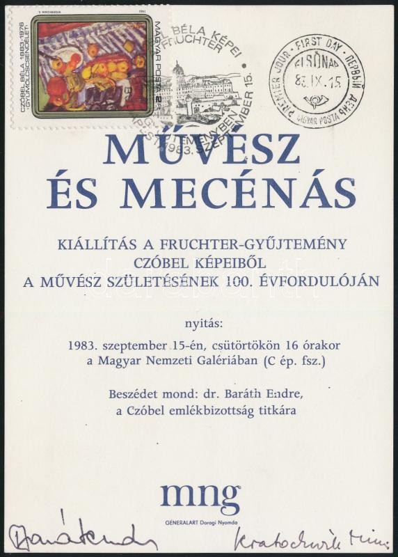 Beschreibung: Czóbel kiállítás emléklapja Kratochwill Mimi művészettörténész és Baráth Endre saját kezű aláírásával