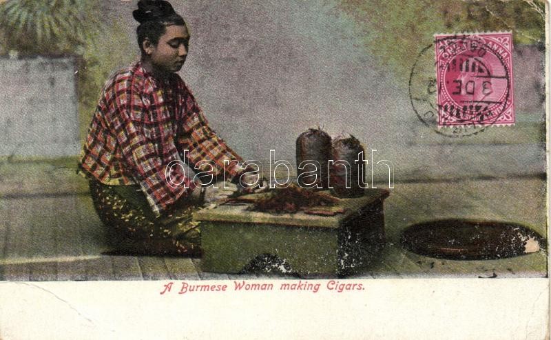 Burmese folklore, woman making cigars. TCV card (EB) https://www.darabanth.com/de/328-Fernauktion/328.0/Ansichtskarten/Folklore~2000067/Burmese-folklore-woman-making-cigars-TCV-card-EB~II1828495