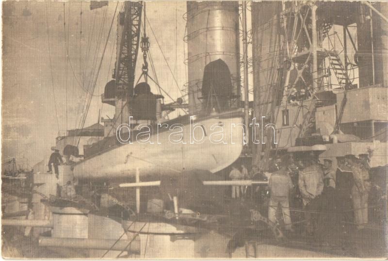 Első világháborús osztrák-magyar hadihajó oldalcsónakja a fedélzeten matrózokkal / WWI K.u.K. Kriegsmarine warship with its side boat on board with mariners. photo