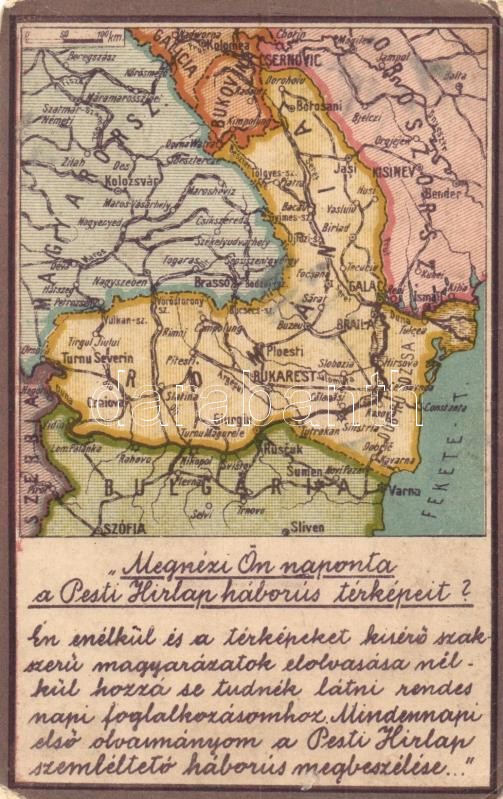 Beschreibung: 'Megnézi Ön naponta a Pesti Hírlap háborús térképeit?'; A romániai háború térképe; kiadja a Pesti Hírlap / WWI Map of the Romanian war (EK)