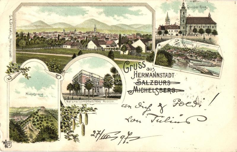1899 Nagyszeben, Hermannstadt, Sibiu; Michelsberg, Salzburg, Naturwissenschaftliches Museum, Grosser Ring / Kisdisznód, Vízakna, Természettudományi Múzeum, látkép. G. A. Seraphin / Cisnadioara, Ocna Sibiului, Natural History Museum. Ottmar Zieher floral Art Nouveau litho (kis szakadás / small tear)