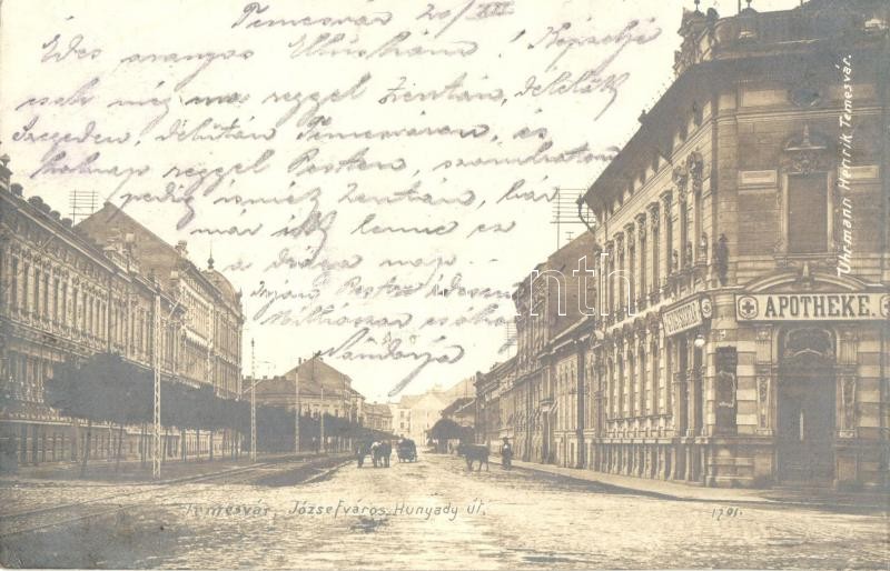 Beschreibung: 1904 Temesvár, Timisoara; Józsefváros, Hunyady út, Gyógyszertár. Uhrmann Henrik kiadása / street view, pharmacy (EK)