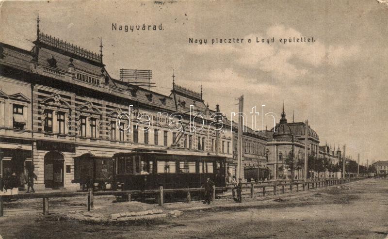 Beschreibung: 1908 Nagyvárad, Oradea; Nagy Piac tér, Lloyd épület, Andrényi Károly és fiai Vasudvara, Weisz Kálmán és társa üzlete, villamos. W.L. 971. / square, shops, tram (EK)